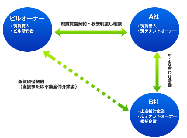 弊社のお客様同士で、「弊社のお取引先A社の退店予定物件を、弊社のお取引先B社に水面下でお引き合わせする」ことを目的としたご案内です。